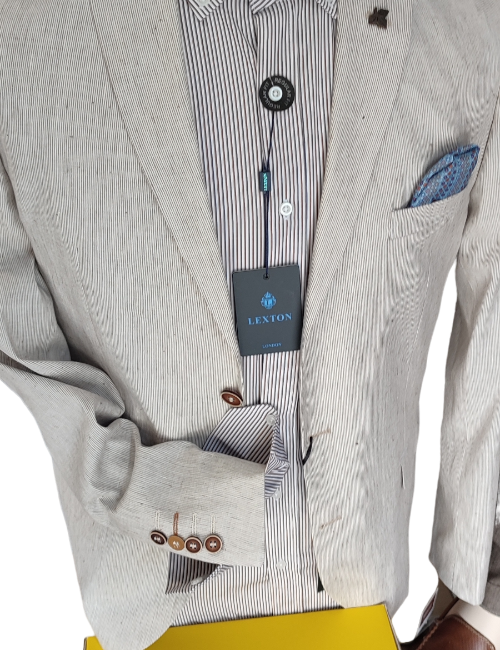Λινό 62% βαμβάκι 36% ελαστάν 2% για ελαστικότητα στις κινήσεις Απαλό ριγέ στο χρώμα άκρως καλοκαιρινό χωρίς ολόκληρη φόδρα