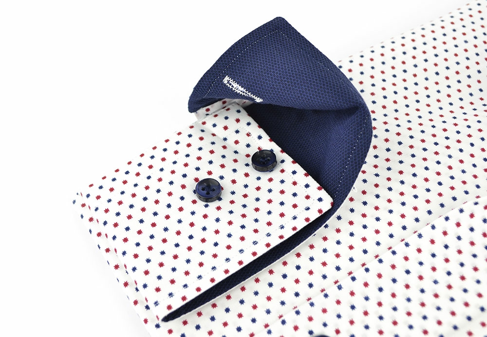 Μοναδικό πουκάμισο Μakis Tselios ελληνικής ραφής με υπέροχες λεπτομέρειες μπλε και κόκκινο πουά με χαρακτηριστικά ιδιαίτερα μοντέρνα για μια μοναδική εμφάνιση.